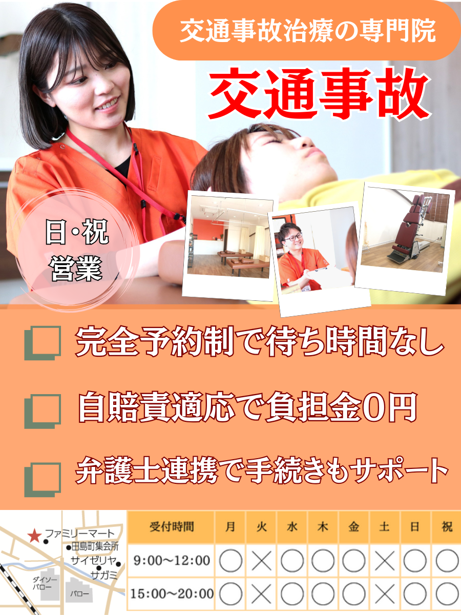 - 交通事故患者様は原則自己負担金0円で施術をうけられる